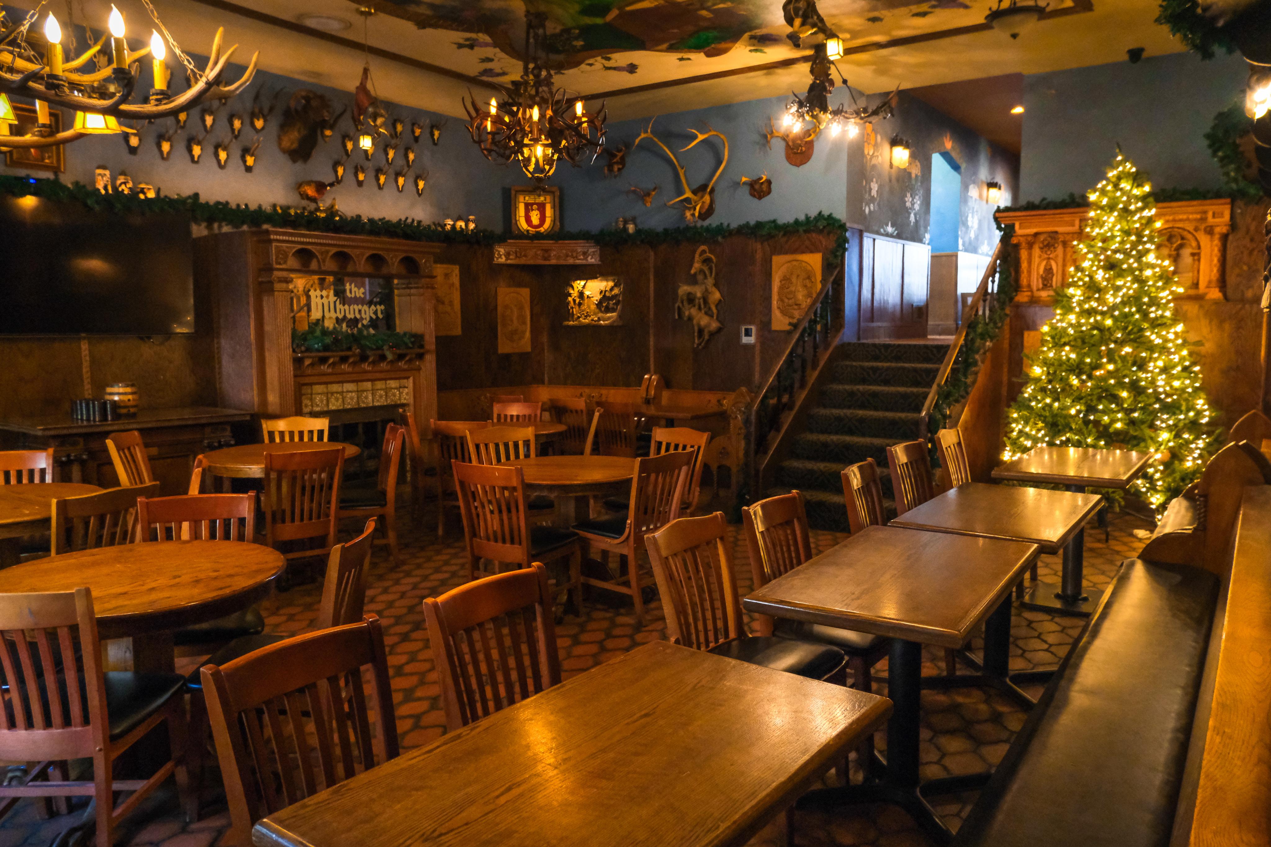 Slightly hidden behind our main bar, you'll find our beautifully decorated back room: Von Trier's Bitburger Stube. Featuring ornate German décor, authentic stained glass from Trier Germany, hand-painted murals, carefully-crafted wood carvings, antique Beer Steins, a historic Karl Ratzsch's antler chandelier, and more!